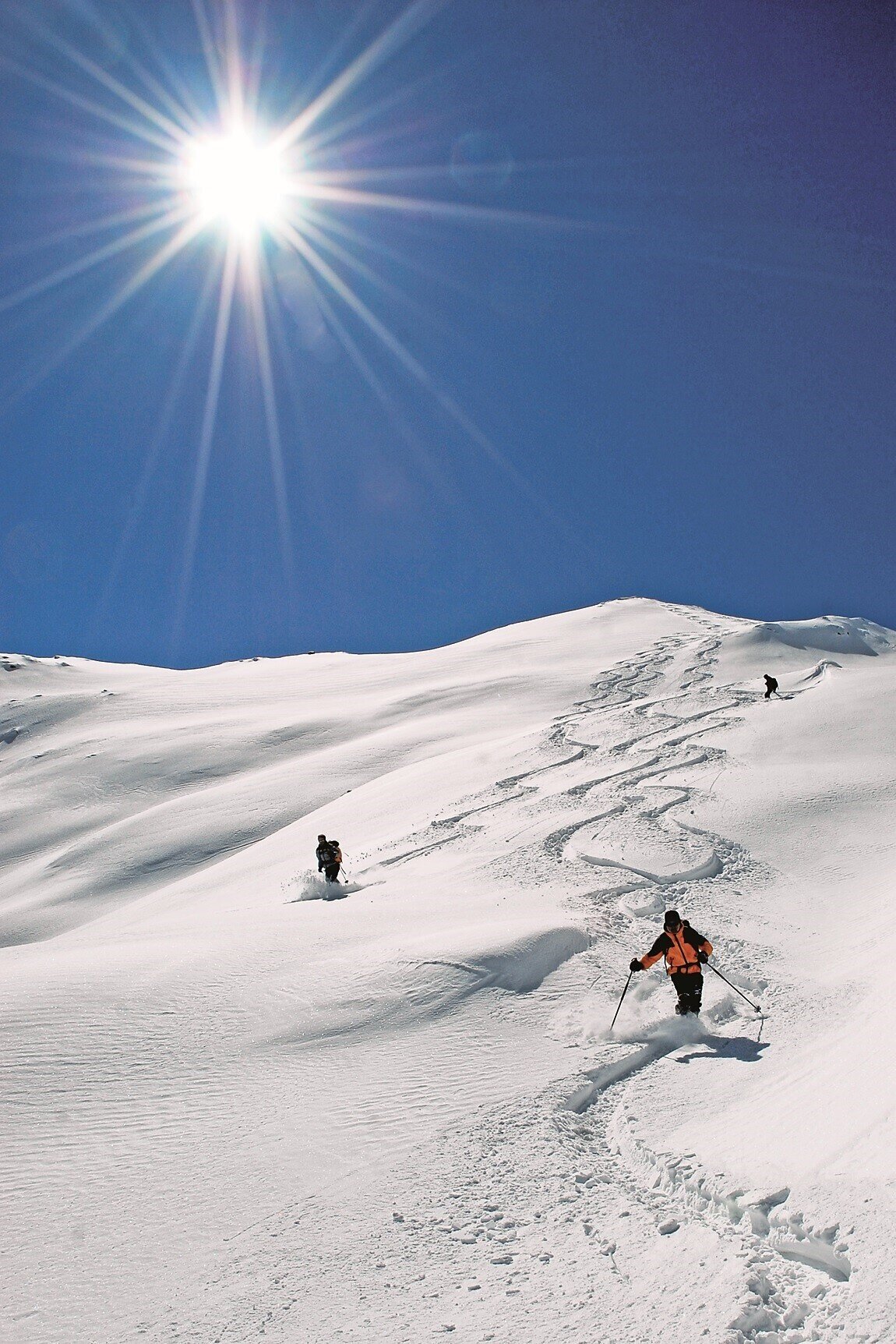 From the car park, hike past the signs on the right and uphill through the forest until you reach the sledging track (1730 m) leading to the Moarhofalm inn. At the nearby crossing, take a left and continue along the forest road (towards Pichler-Berg and Kaltwassertal-Alm) all the way to the edge of the forest just above the Moarhofalm inn, where the road ends. Take the short, steep slope up to the broad basin near the Pichler-Berg inn (2080 m) and head north continuing straight ahead across the ample landscapes (heading west would take you up to Giogio-Amjoch). Then hike up the two short slopes and into the dip to the east of Monte Mutta-Mutenock. At 2295 m, head west and cross the broad ridge (south of another large dip) towards the peak. Hike up the steep, wide ridge on the eastern face of Monte Mutta-Mutenock to get to the peak. To return, ski down the same route or take a short detour exploring the extensive slopes beneath the peak.