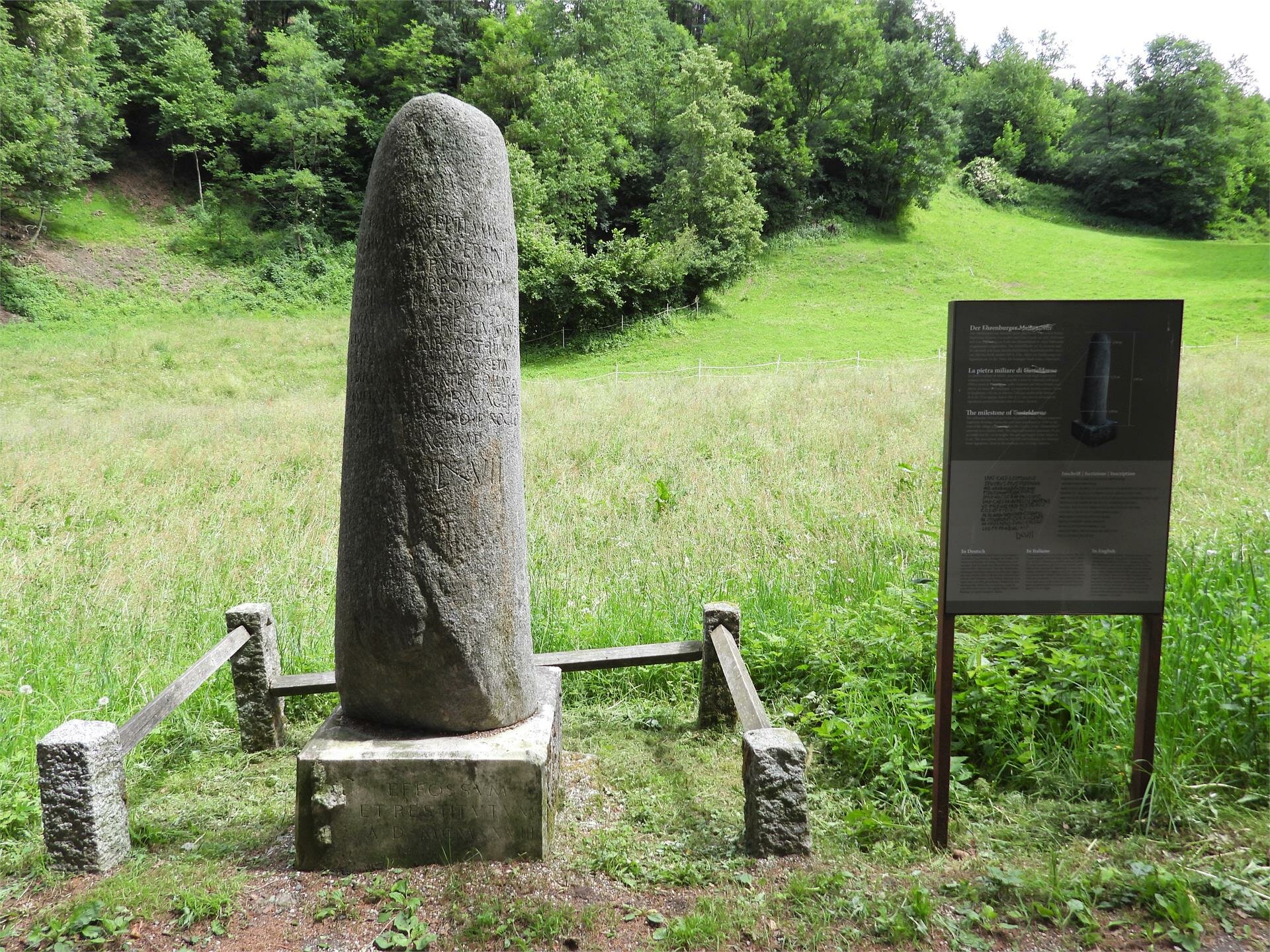 The milestone of the roman emperors Septimus Severus, Caracalla end Geta was found in 1928 to the west of the village of Casteldane- Italy in the vicinity of the “Hinterbühel” and was inserted in a country wall. The Roman road passes the milestone (made of local quartz phyllite), which has the following dimensions: Over-all height: 1.95 m Top circumference: 1.54 m Central circumference: 1.71 m Bottom circumference: 1.89 m The engraved surface measures 82 cm in height and 74 cm in width: the average height of the letters is 4 cm. The milestone dates back to 201 AD and indicates the distance from Aguntum, a roman town close to the modern city of Lienz-Austria. Starting point: Kiens (782 m) at the tourist office; parking facilities nearby, bus stop. Cross the main road (state road SS 49), and between the Gasthof Gatterer (inn) and the Sparkasse bank building head south down to the bridge across the River Rienz. Walk over the bridge and through the railway underpass and now always follow the No. 5 blue-and-white trail markers: first walk east for about 300 m, then turn south and proceed on that path until you reach the first houses of Ehrenburg. From there continue on the tarmac road for about 100 m as far as the turn-off for the “Straße am Römerstein” (road). Now proceed in a westerly direction, always following the No. 5 blue-and-white markers to the milestone. From there initially keep heading west and subsequently take the track which runs north until you reach the road which runs parallel to the railway lines. From there walk east back to the Rienz bridge and to the starting point. Total walking time: about 1 ½ hours Standard: easy Summary: This walk is especially interesting from a botanical point of view since the vegetation is rich and varied.