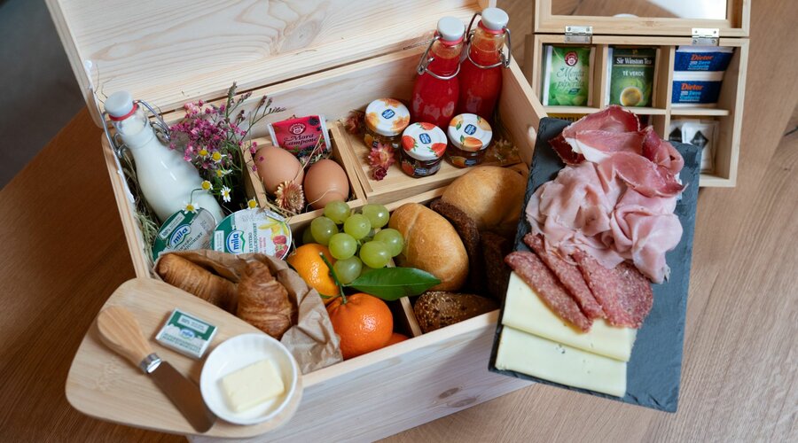 Dalle ore 7:00 vi attende un cestino colazione preparato con cura, consegnato direttamente davanti alla porta del vostro appartamento, presentato con eleganza in un cesto di legno.