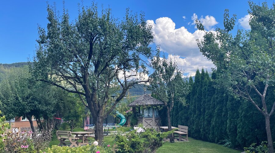 Auch der Garten schenkt Ihnen Raum für Genuss und Entspannung. Frühstück im Grünen, ruhige Stunden auf der Sonnenliege und dabei ein beeindruckender Panoramablick auf den majestätischen Kronplatz – ein Anblick, der zu jeder Tageszeit fasziniert.