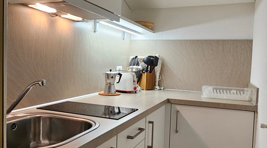 Das geschmackvoll eingerichtete Schlafzimmer sorgt für erholsame Nächte, das moderne Bad mit Dusche bietet Komfort auf zeitgemäßem Niveau. In der voll ausgestatteten Küche bereiten Sie mühelos Ihr Frühstück oder ein leichtes Abendessen zu. Die gemütliche Schlafcouch schafft zusätzlichen Raum zum Entspannen.
