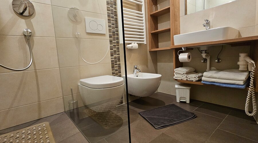 Un vero punto di forza sono i due balconi – i vostri palchi privati con vista aperta. Al mattino vi accolgono i primi raggi di sole con una tazza di caffè o tè, mentre l’aria fresca di montagna accompagna l’inizio della giornata. Nel pomeriggio, dopo un’escursione o una pausa sul prato con un buon libro, il balcone diventa un rifugio di tranquillità. E quando scende la sera, si crea un’atmosfera speciale: una grigliata nella luce dorata del tramonto, un bicchiere di vino o una birra fresca in mano, conversazioni all’aria aperta – momenti che restano nel cuore.